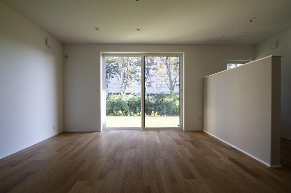 19.8帖の広々としたLDKです。キッチンからリビングや庭への見通し良く、子供がリビングで遊んでいる際にキッチンから見守ることができます。