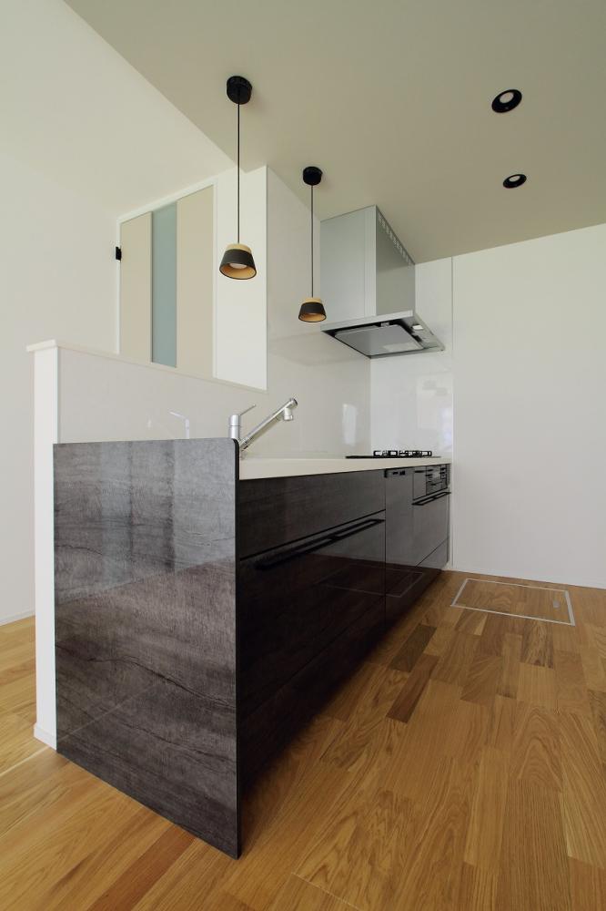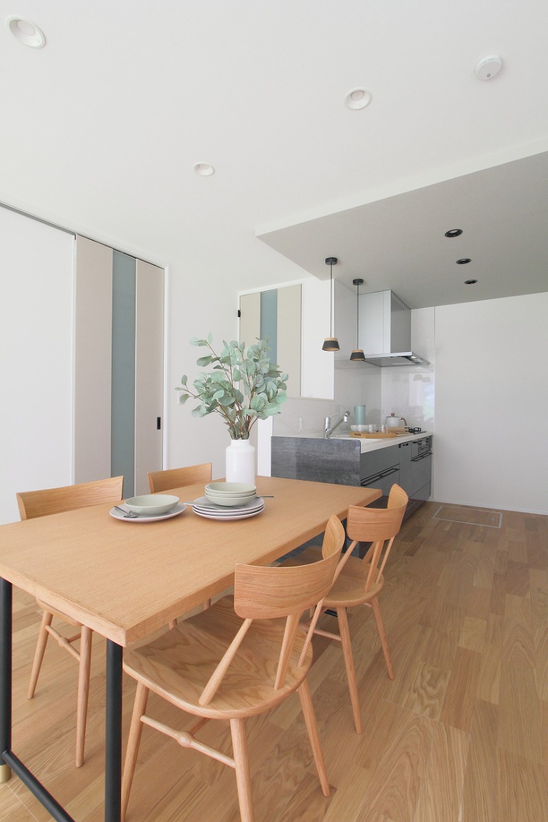 ご要望で最上位にくる横並びのダイニングキッチンで家事ラクで家族団欒を演出。