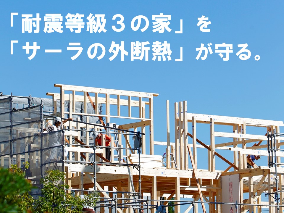サーラの分譲住宅は「耐震等級3」で、震度6強から震度7の強い地震に対しても倒壊しにくい設計がされています。また、「外断熱工法」により、その丈夫な構造体を極端な温度変化による膨張や収縮の繰り返しから防ぎ、また、壁体内結露を抑制することで、壁内部の湿気による建材の劣化から防ぎます。