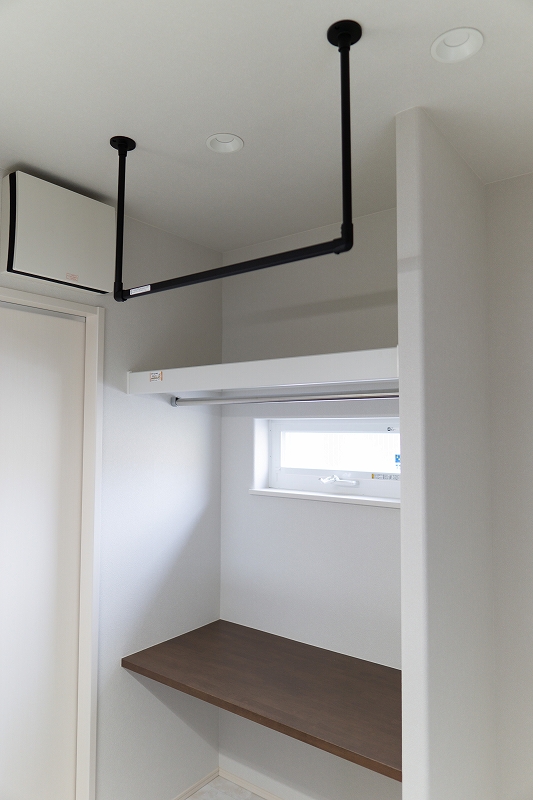 広々洗面室にポールを設置。お風呂上がりのお子様をサッと拭いてタオルのチョイ掛けにも便利です。