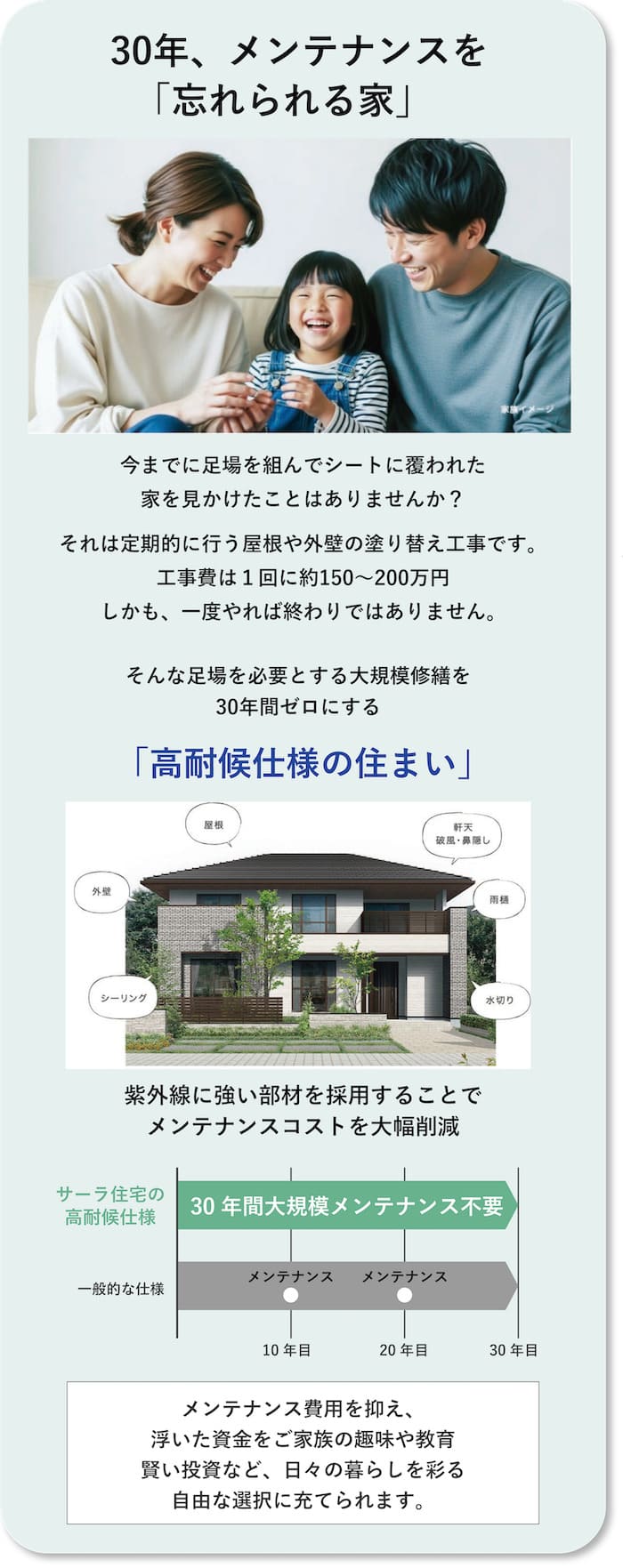 サーラ住宅は50年点検・保証で安心を提供。業界屈指のアフターサービスで、大切な住まいを長期サポートします。