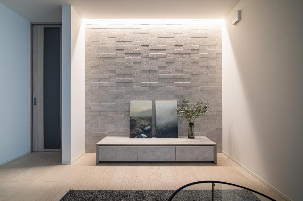 シンプルで落ち着いたLDKの中でひと際存在感のあるリビング。間接照明の柔らかい光がエコカラットの豊かな表情を映し出す、まさに家の主役となる空間です。