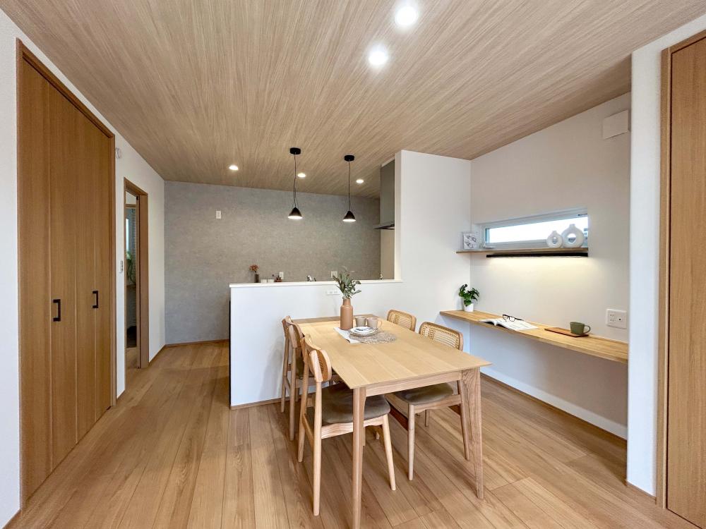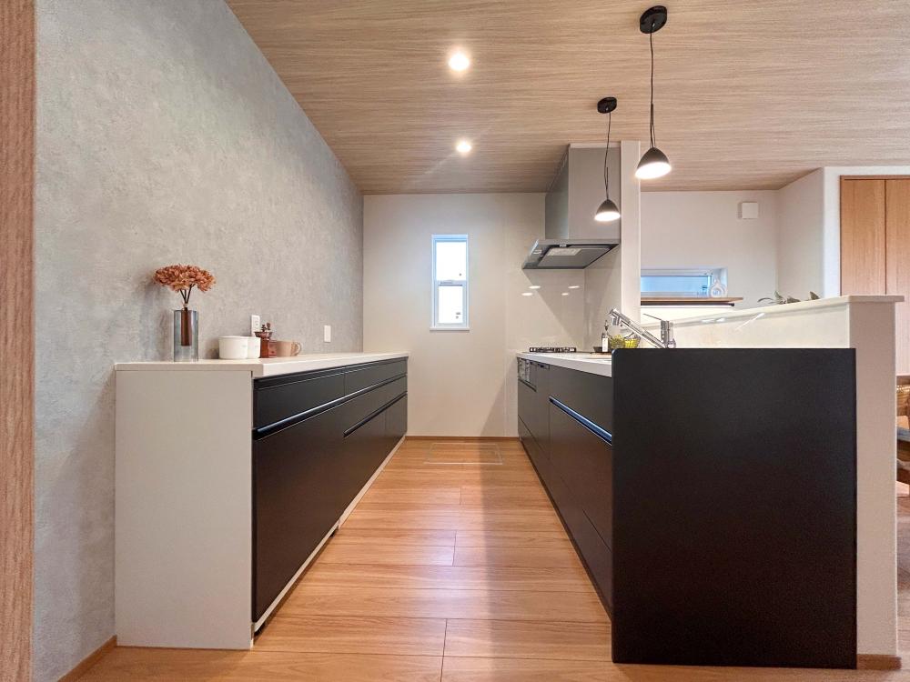「天井一面に広がる温かな木目と、キッチンカウンターのマットな質感を大胆に対比させました。ナチュラルな素材感の中にブラックのアクセントを効かせることで、空間がボヤけず、引き締まった印象を与えます。優しいだけではない、都会的なセンスを感じさせるコーディネートです。」