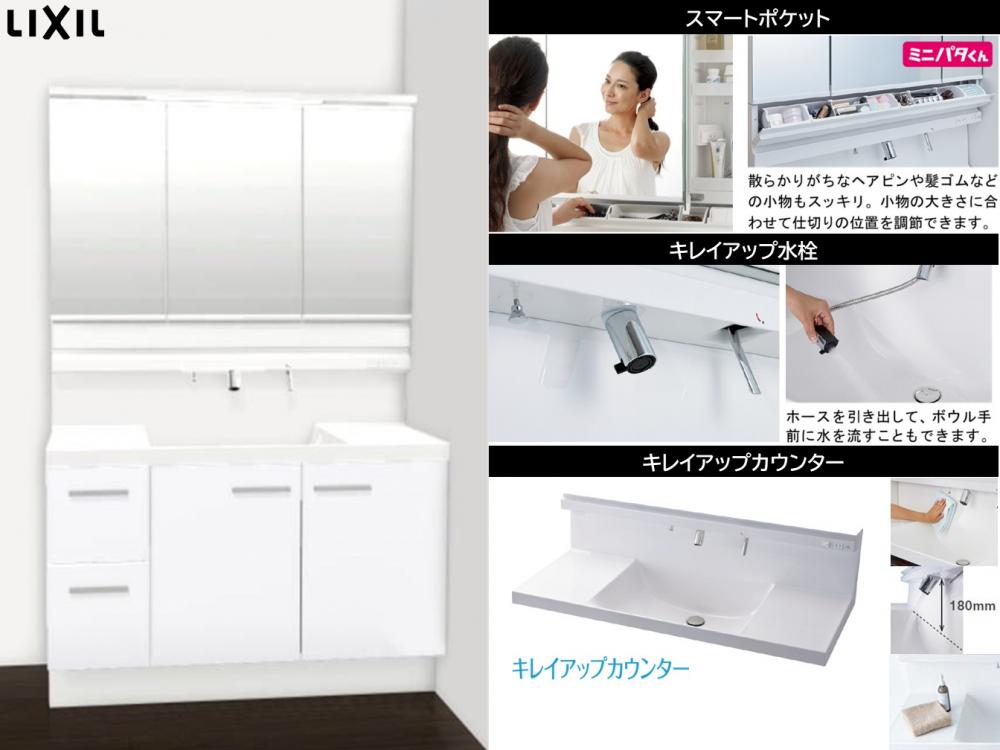 特に、水栓周りの清掃性を向上させる「キレイアップ水栓」や、豊富な収納スペースが特徴です。美しい洗面空間と快適な使い心地を両立します。 -