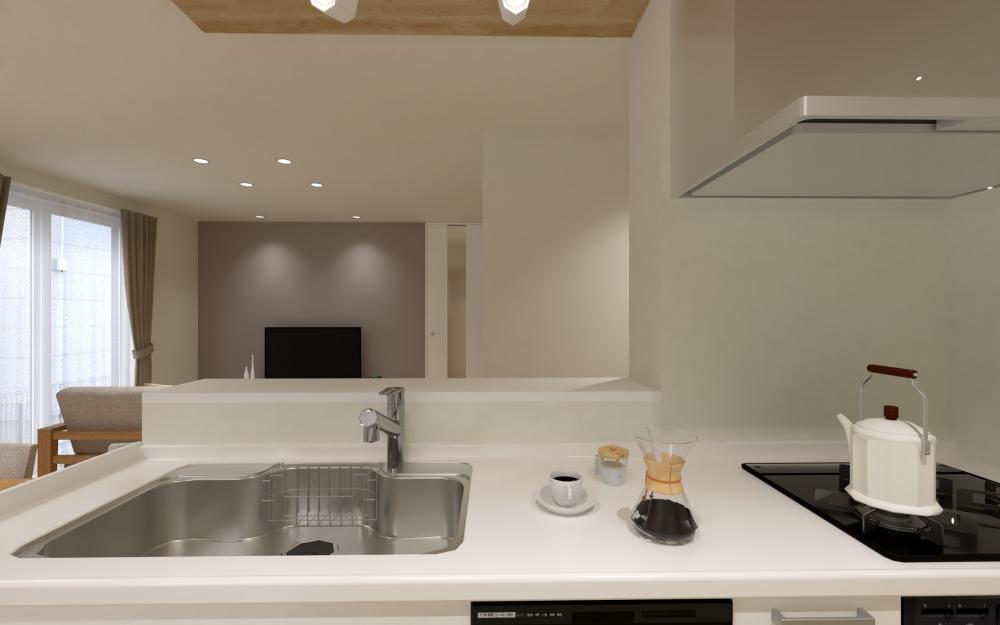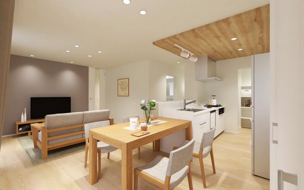 キッチン上部には木目の折り下げ天井を採用し、空間にリズムとデザイン性をプラス。リビングとダイニングが一体となりながらも、それぞれが心地よく機能するように設計されています。