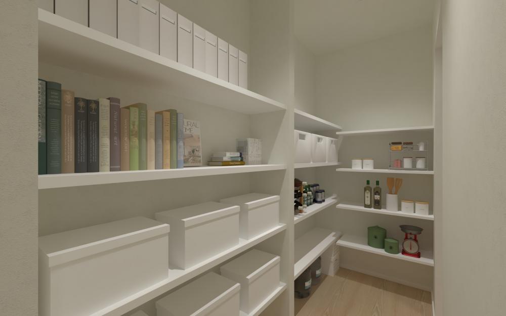 ダイニングをキッチンとスムーズに繋がる横並びで配置することで、配膳・後片付けがワンアクションで行える理想的な家事動線を実現。広々とした調理スペースと、キッチン奥に見えるパントリーなどの収納により、LDKを常にすっきりと保てます。