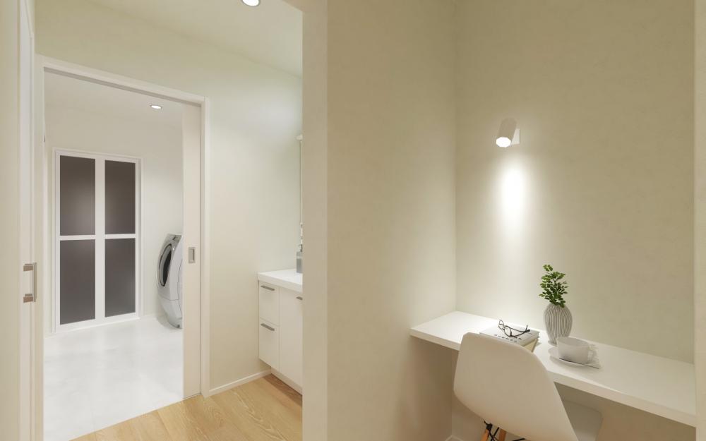 廊下の一角に設けられたカウンターは、リモートワークや読書、書き物など、様々な用途に使えるマルチなパーソナルスペースです。壁付けのダウンライトが優しく手元を照らし、集中できる環境を提供します。