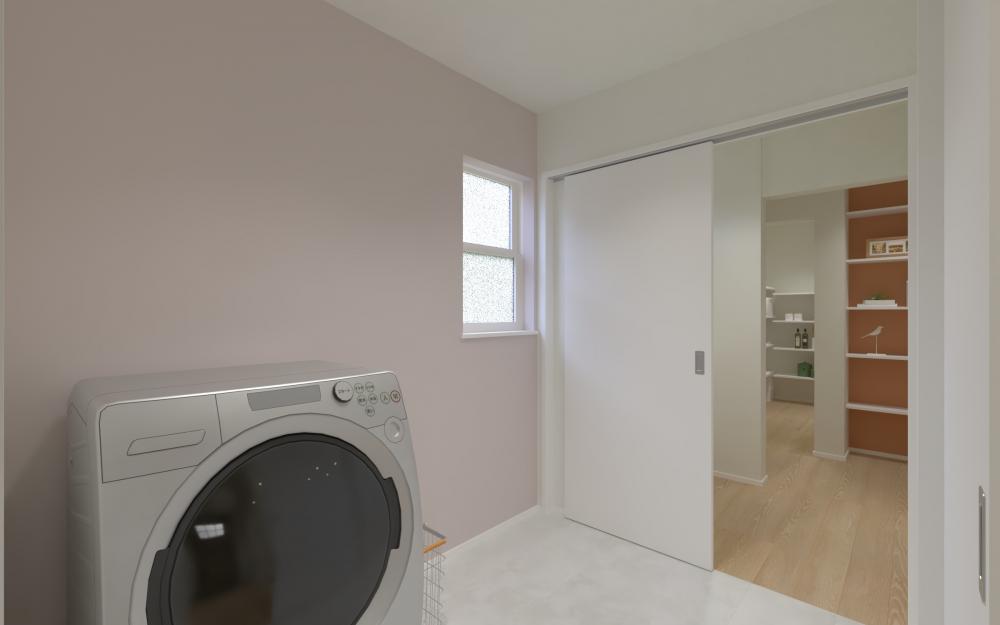 その奥には、洗面化粧台とランドリースペースが続き、効率的な水回り動線を実現。洗濯機スペースは白と黒のサッシが印象的な窓に面しており、明るく清潔感あふれる空間です。