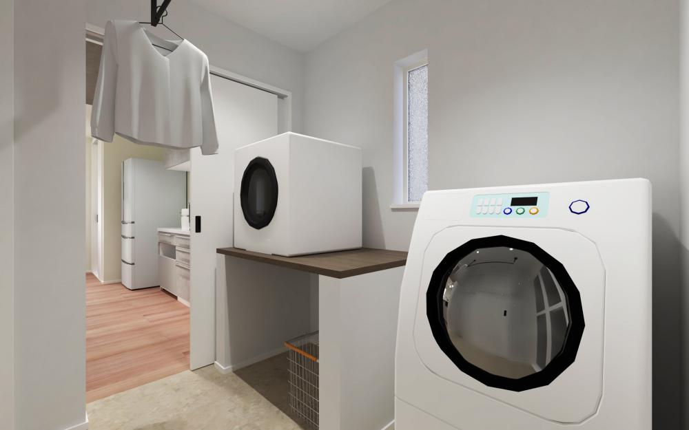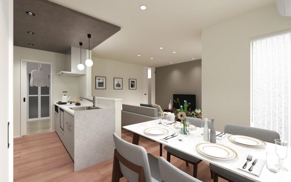 リビングからダイニング、キッチンへ視線が抜け、お子様の様子を見守りながら家事ができる安心感があります。たっぷりの自然光を取り込む大きな窓は、日中は照明いらずの明るさを提供。