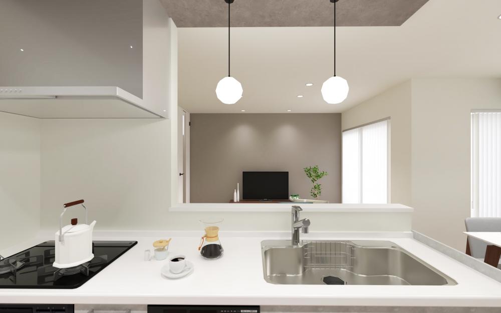 料理中でもリビングの様子やダイニングで宿題をするお子様の姿を見守れる、オープンカウンターキッチンを採用。孤立しがちなキッチンタイムが、家族とのコミュニケーションの時間へと変わります。