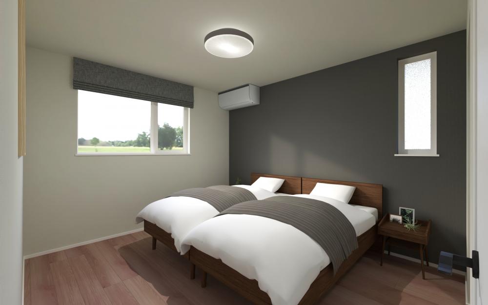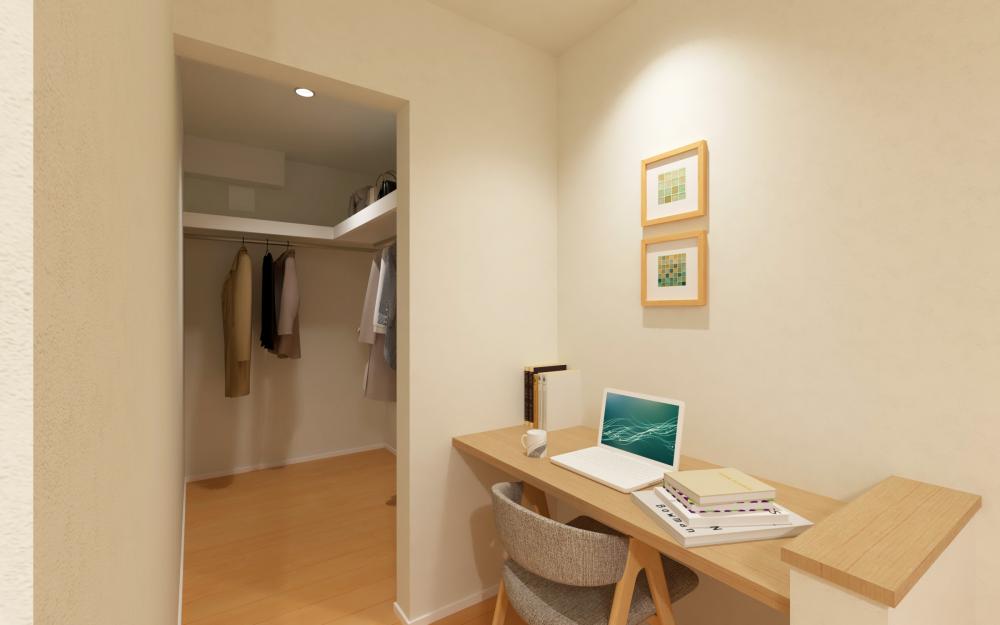 主寝室に隣接した空間には、カウンター付きの書斎コーナーを設けました。仕事や趣味に集中できるパーソナルな空間として、また、ちょっとした調べ物や家事スペースとして、多様な使い方が可能です。さらに、大容量のウォークインクローゼット(2.2帖)も備え、衣類はもちろん、季節のアイテムまでたっぷり収納できます。