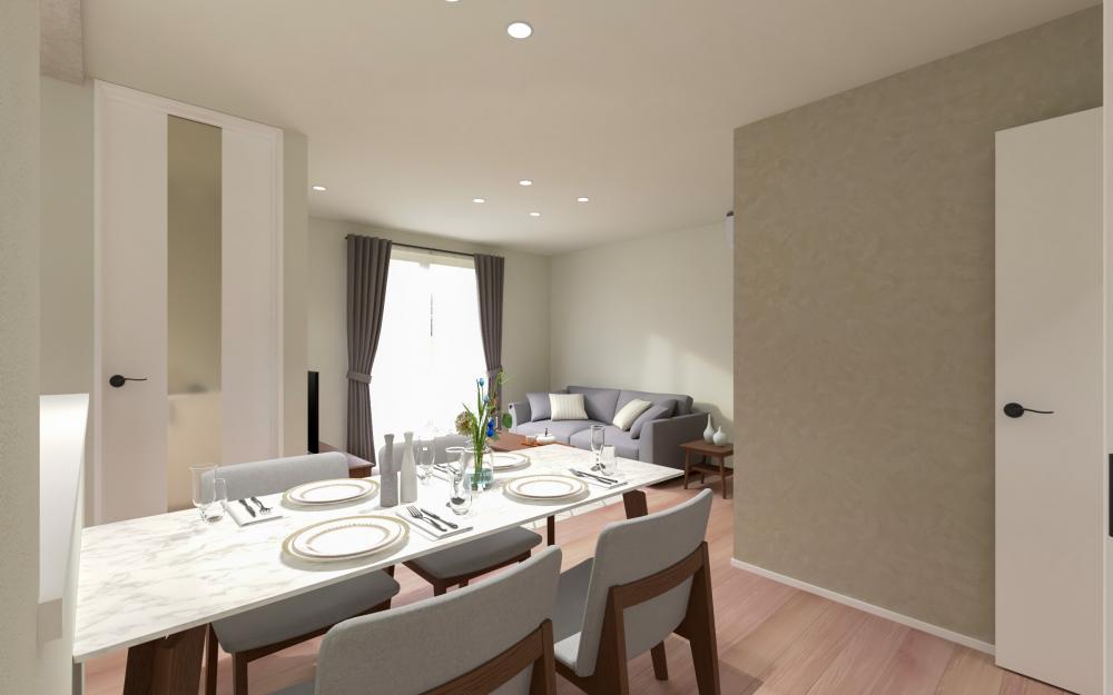 広々としたLDKには、暮らしを快適にする工夫が凝らされています。特に、キッチンから洗面脱衣室へ直接行き来できる理想的な動線が魅力です。料理をしながら洗濯機を回したり、お子様のお風呂の準備をしたりと、「ながら家事」がスムーズに行え、忙しい毎日をサポートします。