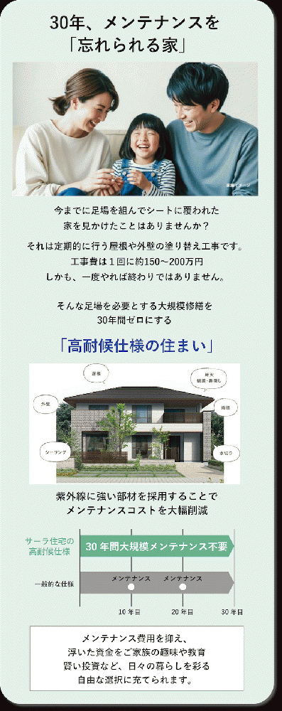 修繕工事に足場が必要となる部材をすべて30年の耐久性を持つものに揃えた「高耐候仕様」でメンテナンスコストを大幅に削減。10年後、20年後のコストを抑え、お財布にも優しい住まいを実現しました。