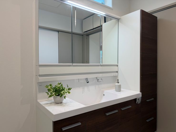 すっきりとしたデザインと使い勝手の良さ、清潔に保ちやすさで人気の洗面化粧台です。お手入れしやすい構造になっているため、清潔に保つことができます。 -