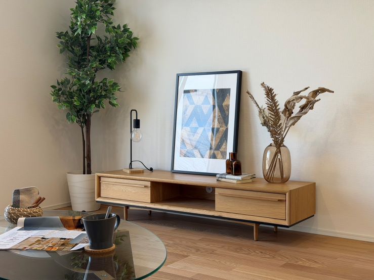 天然木の銘木を使用しているため、一枚一枚異なる木目と風合いが楽しめます。また、ランダム幅の採用により、より自然でリズミカルな空間を演出することができます。 -