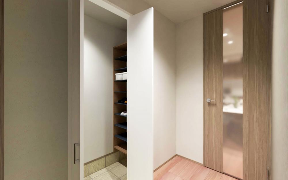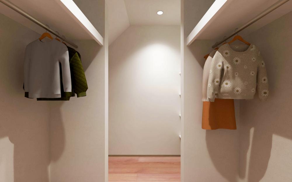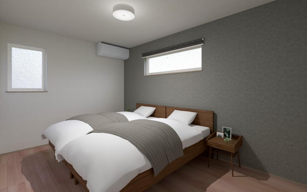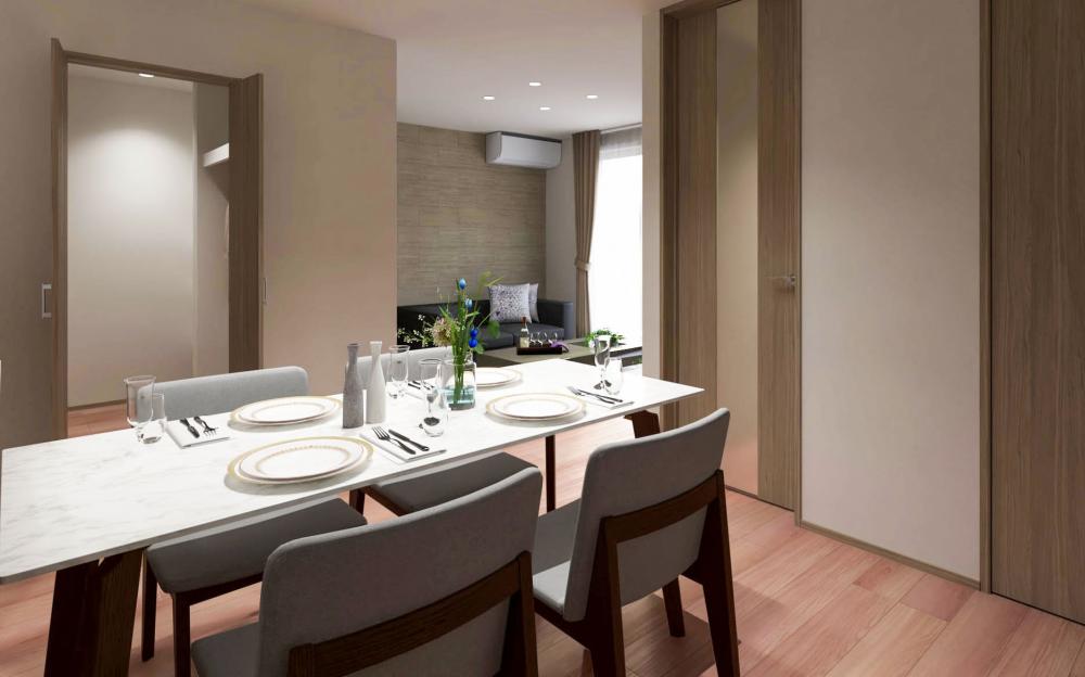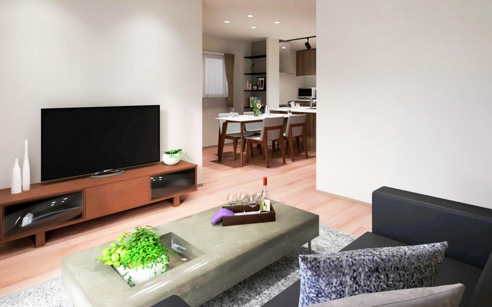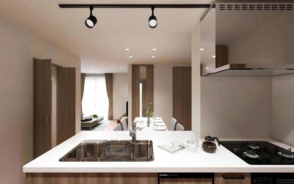 〔No.4〕キッチンからダイニング、リビングまでを見渡せるフラットな空間設計。 ダウンライトの柔らかな光が、木目の美しいフローリングを優しく照らします。 視線を遮らないレイアウトは、お料理中も家族との会話が弾み、自然と笑顔が集まる場所に。 質感豊かなアクセントウォールが、リビングにワンランク上の上質さを添えています。
