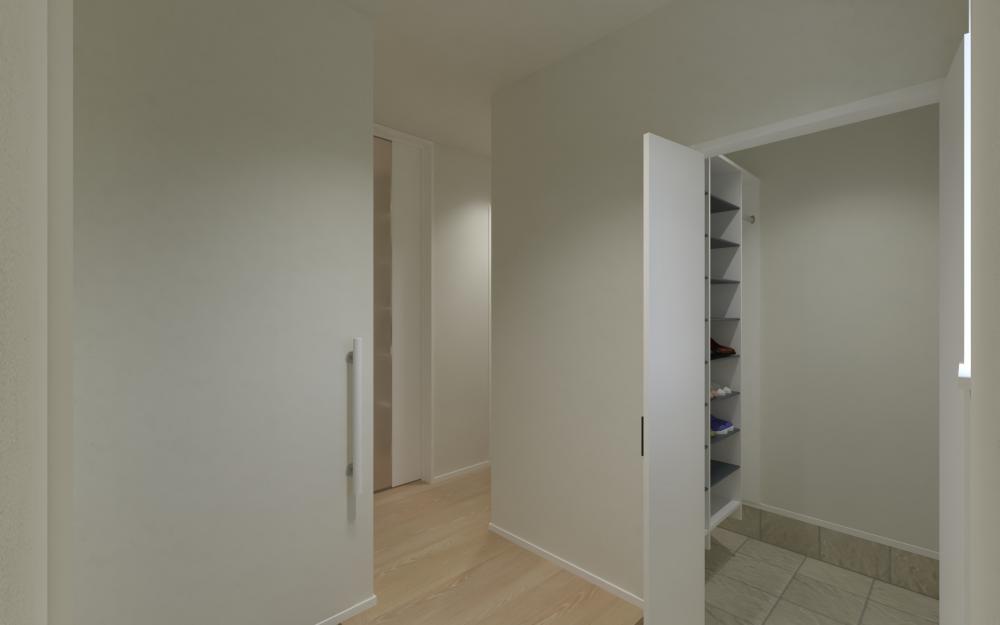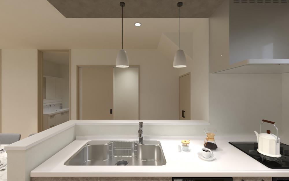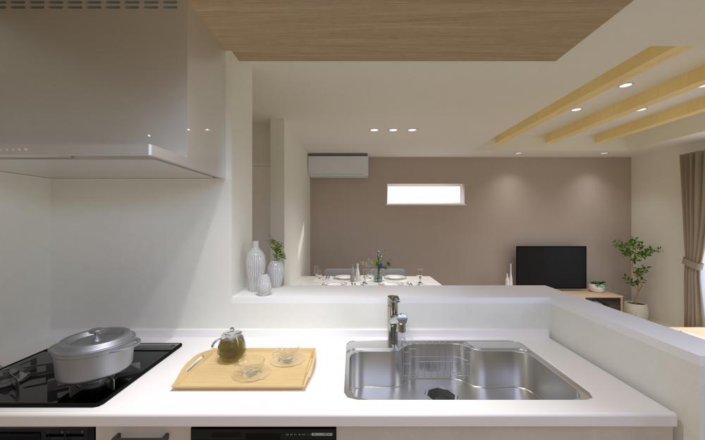 キッチンからリビングまで、遮るもののない真っすぐな視線。天井の高さに変化をつけることで、ひと続きの空間の中に心地よいリズムが生まれました。開放感はあるけれど、どこか落ち着く。そんな「メリハリ」が、家族の時間をよりゆったりと感じさせてくれます。
