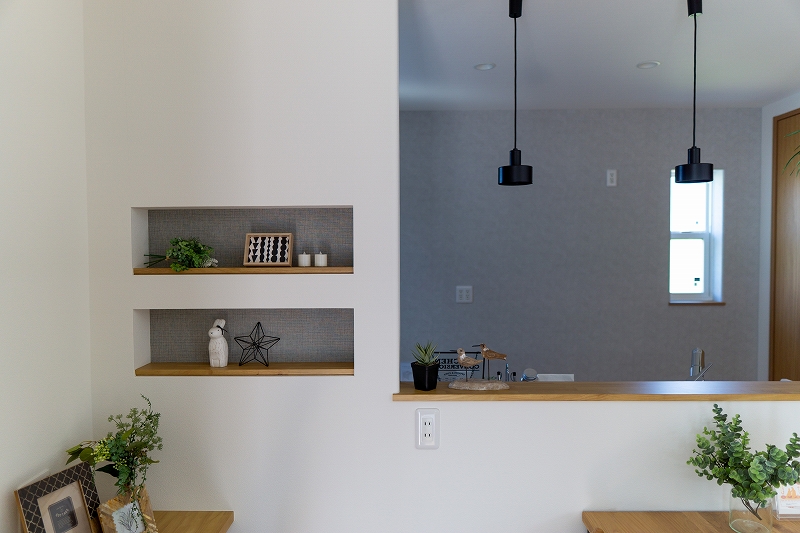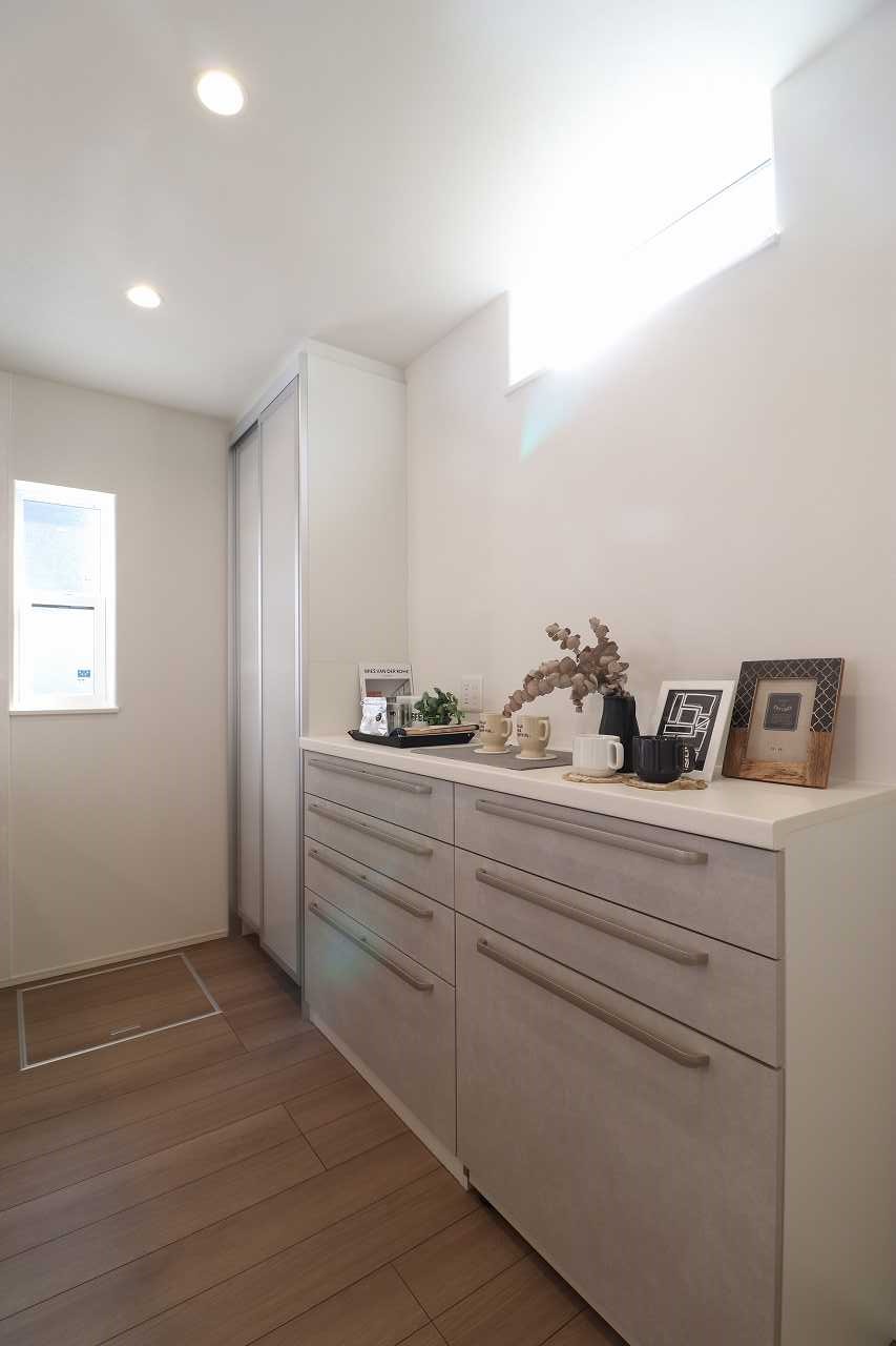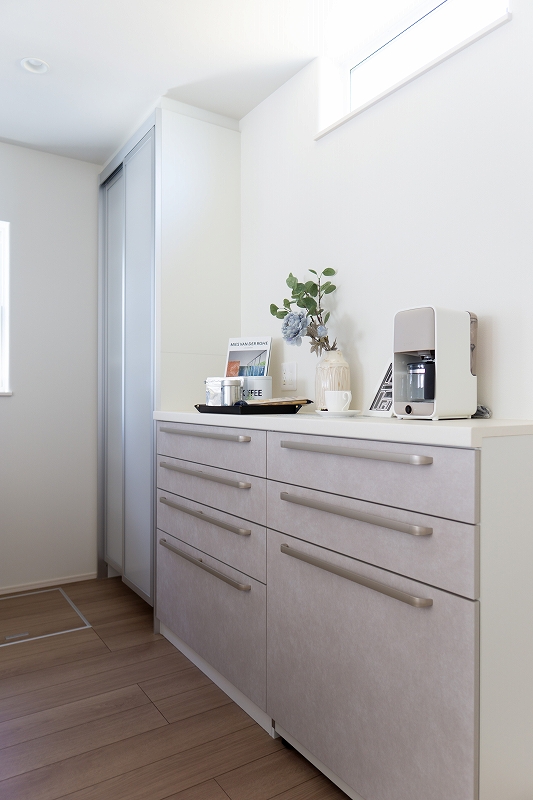 No.1のみカップボード設置済み。カウンタータイプに天井までの収納にをプラス。高さのある収納は普段使わないものもスマートにしまえます。