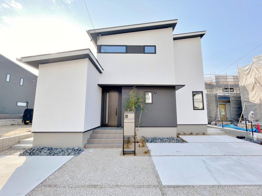 ブラックとグレーを基調とした重厚感のあるモダンな外観が印象的な3LDK住宅。直線的なフォルムと素材感の異なる外壁デザインが、落ち着きのある佇まいを演出します。敷地内には駐車場を3台分確保しており、ご家族用はもちろん来客時にも対応可能。22畳の広々としたLDKは、リビング・ダイニング・キッチンが一体となった開放的な空間で、家族が自然と集まりやすい住まいです。
