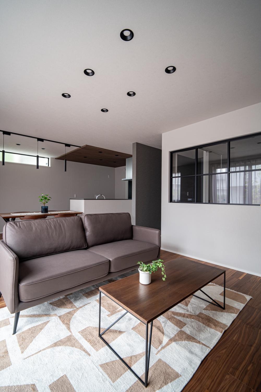 フリースペースからデコマド(室内窓)越しに広がる、温かなLDKの風景。
