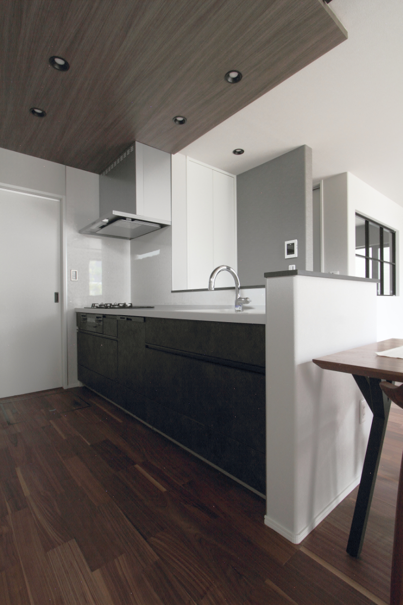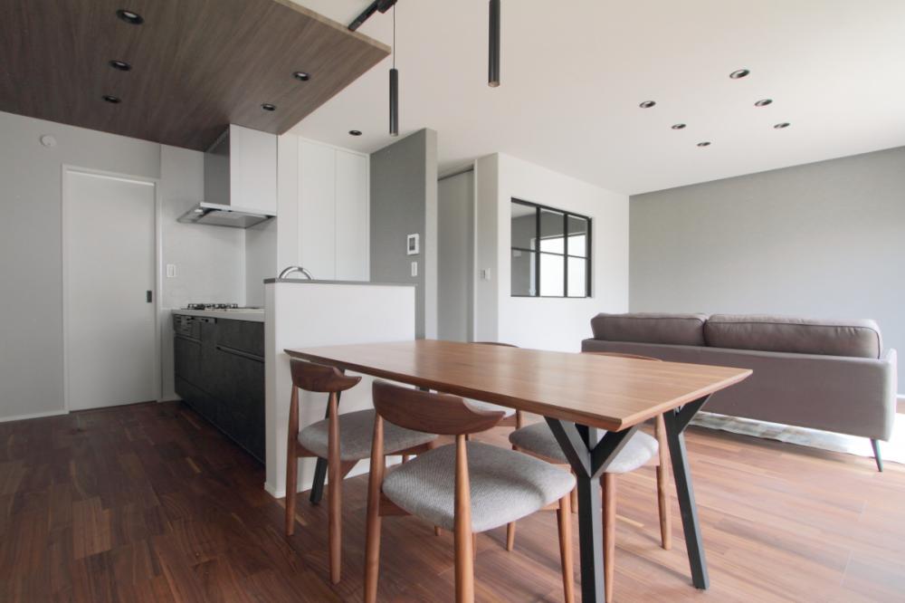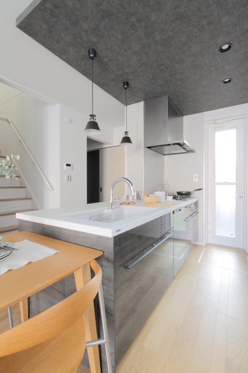 床材に高級感あるウォールナット突板を使用、キッチンにはタッチレス水栓と深型食器洗い乾燥機を完備。使い勝手とデザイン性を兼ね備えた、快適で洗練された空間です。
