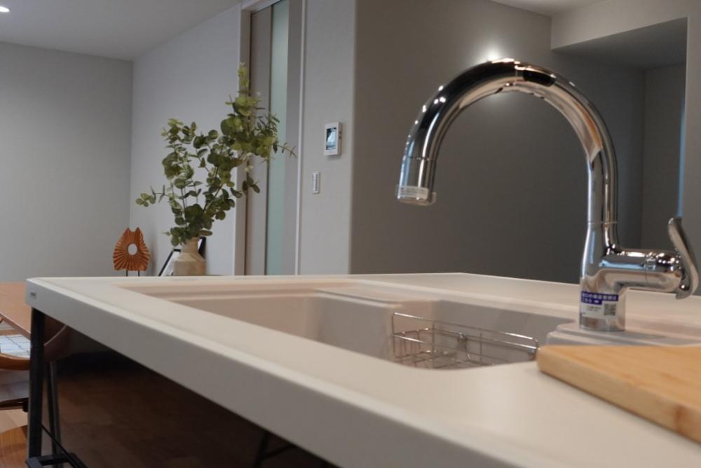 20帖超の広々としたLDKは、家族が自然と集まる心地よい空間。キッチンとダイニングテーブルが横並びで、配膳や片付けもスムーズ。さらに、在宅ワークやお子様の遊び場として活用できるフリースペースも備え、暮らしの幅が広がります。